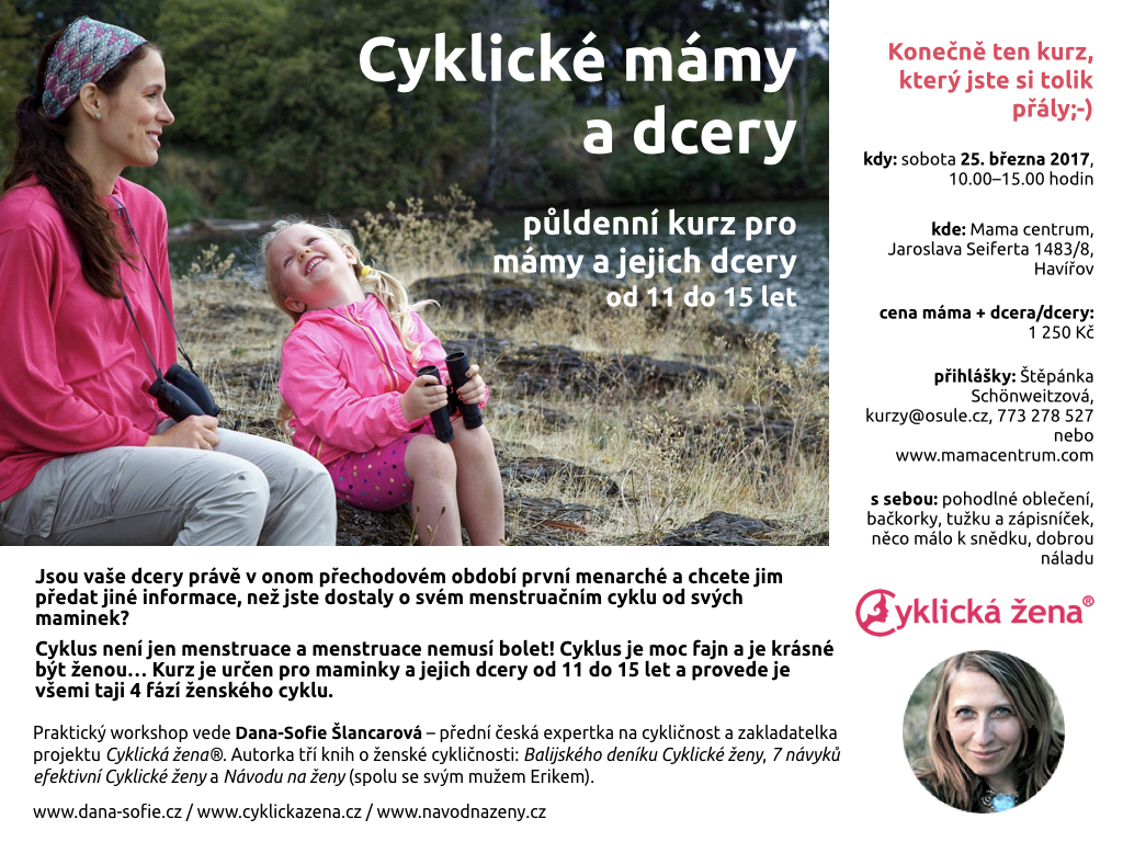 Večerní kurz pro ženy i pro muže na téma „Co jste kdy chtěli vědět o menstruaci, ale báli jste se zeptat“.